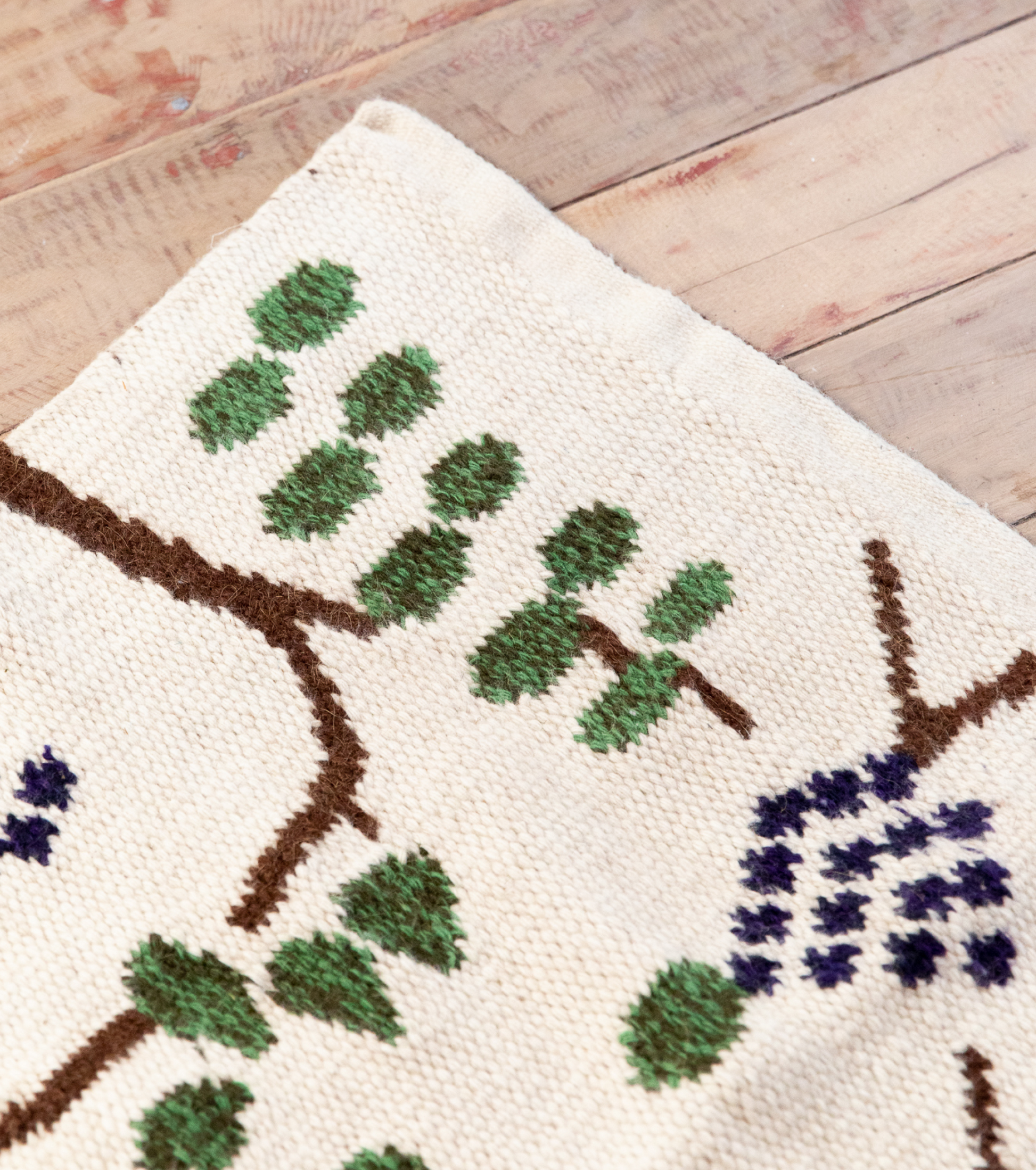 Molle Costero is a wool carpet conceived as a translated drawing: a textile interpretation by master artist-weaver Inocencio Fernández, based on original drawings by Miguel Andrade Valdez, where art, craft, and cultural continuity converge and the weaver’s hand becomes an active author. Inspired by the deep green tonality that runs through Peruvian decorative arts from colonial times to contemporary practices, the piece reflects on color as a carrier of memory, drawing from the observation of vegetal patterns and references to Cusco ceramics, Pucará pottery, and the work of artists such as Grimanesa Neuhaus and Tater Vera.