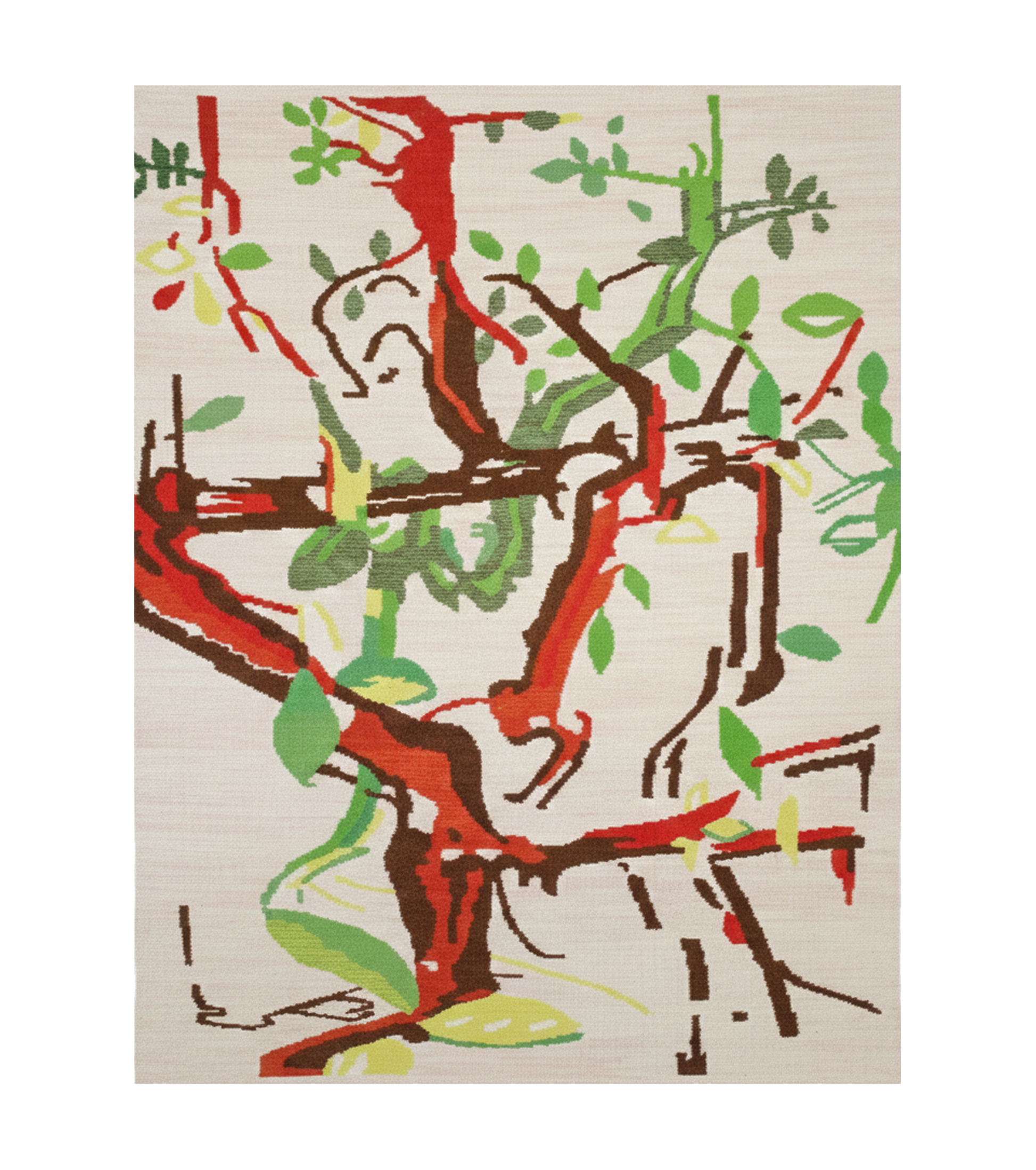 Sebastian is a hand-woven wool carpet conceived as a translation between media: from painting to digital image, and from digital language to textile form. The piece originates from a digitalized tree painting by Miguel Andrade Valdez, created at a moment of personal significance, as his son Sebastian was about to be born. This origin infuses the work with a sense of continuity, growth, and quiet intensity.